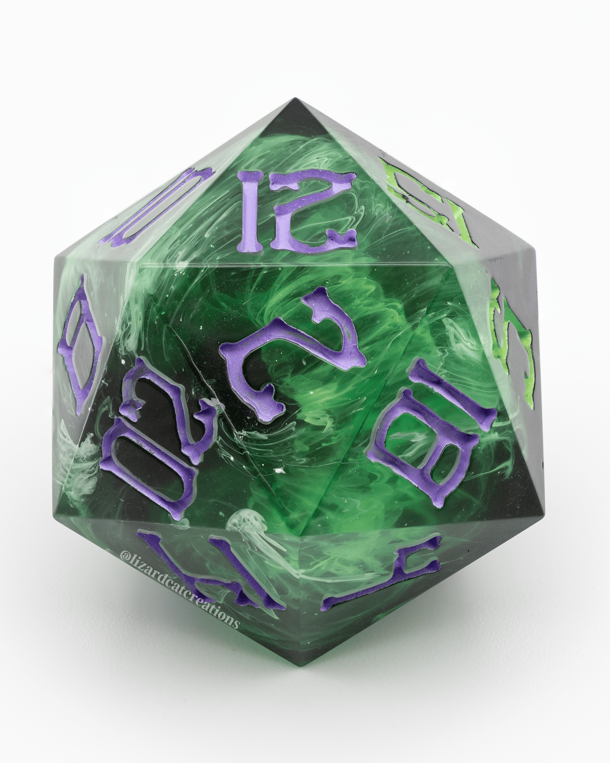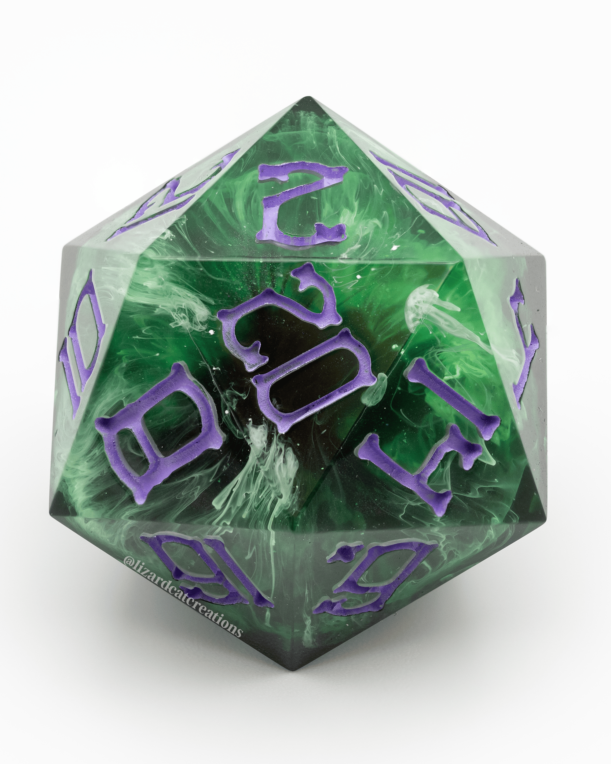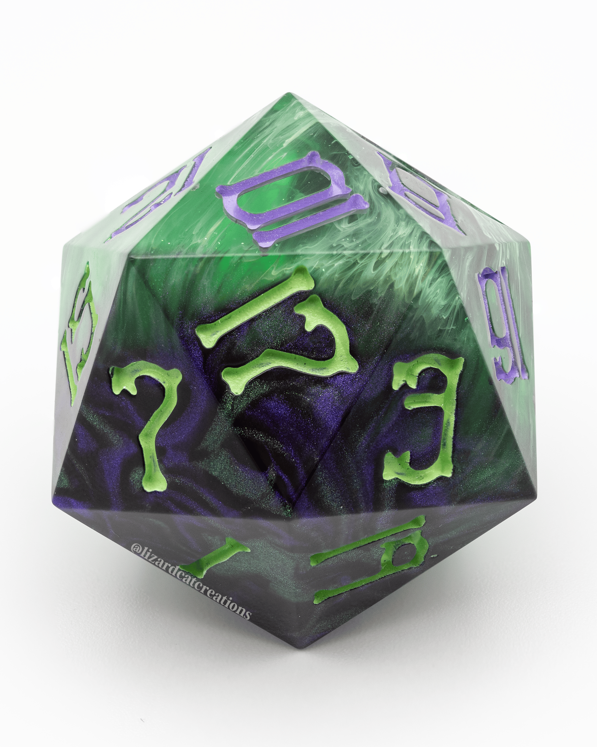 Haunted chonk (32mm d20). Deep green with swirling white wisps atop a sparkling black and purple dirty pour base, inked in matte pastel purple on the green faces and matte pastel green on the dirty pour faces. Glossy finish. Designed, poured, and finished by me.